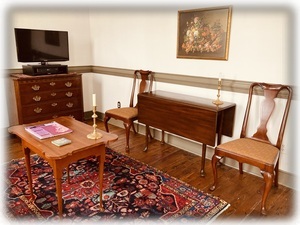 | | The living room with fireplace & river views is furnished in 18th-century style. |