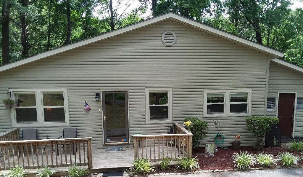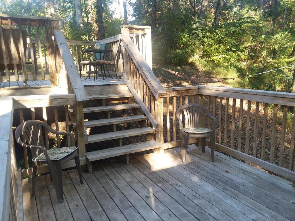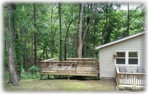 | Front of Chalet Showing Garden & Carport | Front of Chalet Showing 2 of the 3 Decks {Total Deck Seating is 10} |