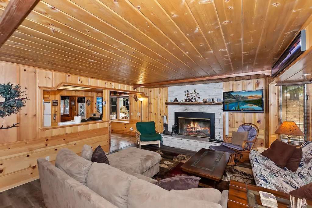 | Please bring wood for the wood burning fireplace. | Brown couch converts to queen sleeper. |