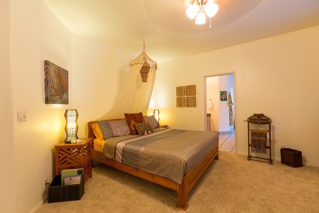 | Elegant Master Bath, glass-enclosed rainforest shower, Jacuzzi and dual vanities | The glass brick wall illuminates the Master Bath and lets in the Hawaiian sun. |